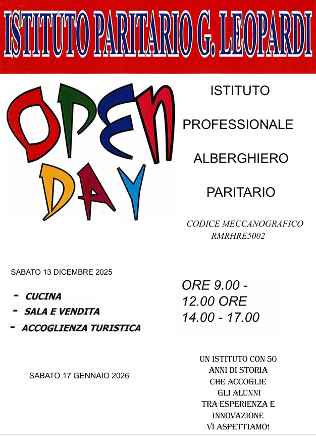 L’Istituto professionale paritario dei Servizi per l’Enogastronomia e l’Ospitalità Alberghiera G. Leopardi, istituto alberghiero paritario di Roma, offre ai suoi studenti l’acquisizione, durante il percorso di studio, delle competenze tecniche nella gestione dei servizi enogastronomici e nell’organizzazione dei servizi di accoglienza, di ristorazione e di ospitalità, attraverso le tre articolazioni: Enogastonomia, Servizi di Sala e Vendita, Accoglienza Turistica.